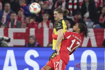 Pesepak bola Bayern Munich Michael Olise (kanan) berebut bola dengan pesepak bola Borussia Dortmund Marcel Sabitzer (kiri) saat pertandingan sepak bola Liga Jerman antara Bayern Munich melawan Borussia Dortmund di Allianz Arena, Munich, Jerman, Sabtu (18/10/2025). Bayern Munich menaklukkan Borusia Dortmund dengan skor 2-1. ANTARA Foto/Xinhua/Philippe Ruiz/agr