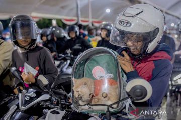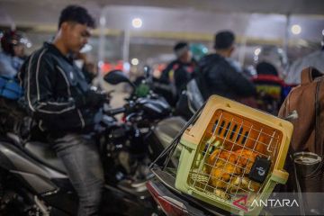 Seekor kucing berada di dalam tas carrier saat pemiliknya menunggu antrean masuk kapal di Pelabuhan Pelindo, Kota Cilegon, Banten, Selasa (17/3/2026). Sebagian pemudik yang menyeberang ke Pulau Sumatera memilih membawa serta hewan kesayangan mereka ke kampung halaman guna menghemat biaya penitipan serta memastikan kondisi hewan tersebut tetap aman dan terawat selama libur Lebaran. ANTARA FOTO/Muhammmad Bagus Khoirunas/nym.
