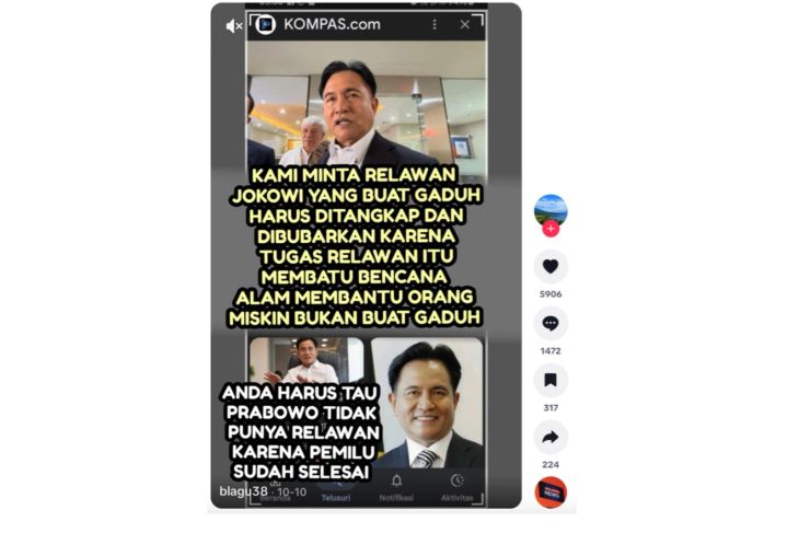 Dalam video tersebut, seolah-olah Yusril meminta agar seluruh relawan Presiden Jokowi yang membuat kegaduhan ditangkap dan dibubarkan.