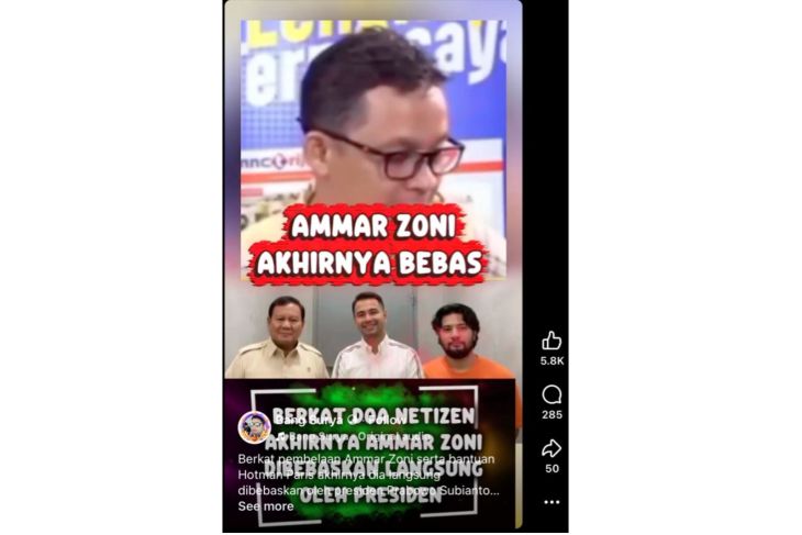 Jakarta (ANTARA/JACX) – Sebuah unggahan video di Facebook menyebutkan bahwa Presiden Prabowo telah membebaskan selebritas Ammar Zoni.