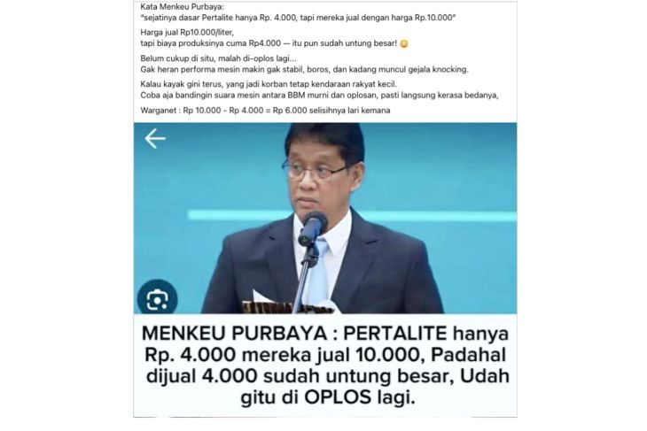 Jakarta (ANTARA/JACX) – Sebuah unggahan di Facebook menampilkan foto Menteri Keuangan Purbaya Yudhi Sadewa dengan narasi yang mengklaim bahwa beliau menyebut harga asli Pertalite hanya Rp4.000 per liter, namun dijual oleh Pertamina seharga Rp10.000.