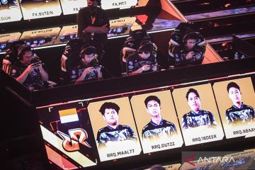Tim Indonesia RRQ Kazu, Maal (kiri), Dutzz (kedua kiri), 18Deer (kedua kanan), dan Abaay (kanan) bertanding pada kategori Battle Royale Finals saat Free Fire World Series (FFWS) Global Finals 2025 di Indonesia Arena, Jakarta, Sabtu (15/11/2025). Dua tim perwakilan Indonesia yakni Evos Divine dan RRQ Kazu bertanding bersama 10 tim dari berbagai negara lainnya pada kategori Battle Royale Finals. ANTARA FOTO/Sulthony Hasanuddin/agr