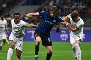 Pemain Inter Milan Pio Esposito (tengah) menggiring bola dan dihalangi pemain Cagliari Yerry Mina (kiri) dan Juan Rodriguez (kanan) dalam pertandingan sepak bola Serie A di Milan, Italia, Jumat (17/4/2026). Inter Milan menang 3-0 atas Cagliari. ANTARA FOTO/Alberto Lingria/Xinhua/nz