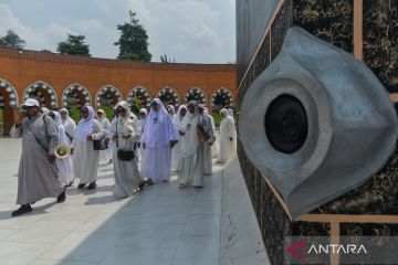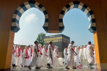 Jamaah calon haji melakukan lempar jumroh saat mengikuti bimbingan manasik haji di Al Mahmudah Manasik Training Center, Tangerang Selatan, Banten, Sabtu (18/4/2026). Kegiatan yang diikuti 300 calon haji tersebut sebagai penerapan ilmu dan meningkatkan pemahaman serta kesiapan fisik jelang pelaksanaan ibadah haji 2026 di tanah suci. ANTARA FOTO/Putra M. Akbar/nz