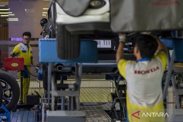 Montir memperbaiki mobil milik pelanggan di Honda IBRM Cimahi, Jawa Barat, Kamis (5/3/2026). Menjelang masa arus mudik Lebaran 2026, permintaan jasa perbaikan dan perawatan kendaraan mobil di tempat tersebut mengalami peningkatan sekitar 50 persen atau 40 sampai 50 mobil per hari dibanding hari biasa hanya sekitar 30 mobil per hari. ANTARA FOTO/Abdan Syakura/bar