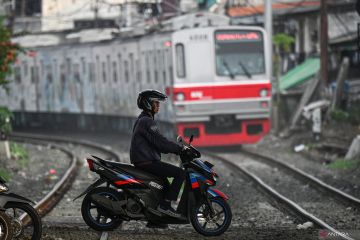 Pengendara sepeda motor menyeberangi jalur perlintasan kereta api tanpa palang pintu di kawasan Roxy, Gambir, Jakarta, Rabu (6/8/2025). PT KAI Daop 1 Jakarta mencatat pada periode Januari hingga Juli 2025, jumlah kejadian kecelakaan kereta api yang melibatkan kendaraan sebanyak 33 kasus dan kecelakaan yang melibatkan orang sebanyak 111 kasus atau meningkat dibanding periode yang sama tahun 2024 yakni 29 kasus melibatkan kendaraan dan 92 kasus yang melibatkan kereta dengan orang. ANTARA FOTO/Fauzan/YU