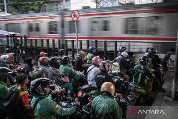 Sejumlah pengendara sepeda motor menunggu untuk menyeberangi jalur perlintasan kereta api tanpa palang pintu di kawasan Roxy, Gambir, Jakarta, Rabu (6/8/2025). PT KAI Daop 1 Jakarta mencatat pada periode Januari hingga Juli 2025, jumlah kejadian kecelakaan kereta api yang melibatkan kendaraan sebanyak 33 kasus dan kecelakaan yang melibatkan orang sebanyak 111 kasus atau meningkat dibanding periode yang sama tahun 2024 yakni 29 kasus melibatkan kendaraan dan 92 kasus yang melibatkan kereta dengan orang. ANTARA FOTO/Fauzan/YU