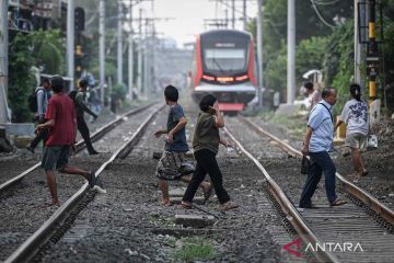 Sejumlah warga menyeberangi jalur perlintasan kereta api tanpa palang pintu di kawasan Roxy, Gambir, Jakarta, Rabu (6/8/2025). PT KAI Daop 1 Jakarta mencatat pada periode Januari hingga Juli 2025, jumlah kejadian kecelakaan kereta api yang melibatkan kendaraan sebanyak 33 kasus dan kecelakaan yang melibatkan orang sebanyak 111 kasus atau meningkat dibanding periode yang sama tahun 2024 yakni 29 kasus melibatkan kendaraan dan 92 kasus yang melibatkan kereta dengan orang. ANTARA FOTO/Fauzan/YU