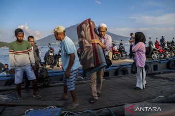 Penumpang tujuan Tidore dan kendaraannya berada di atas kapal kayu saat melintasi perairan Ternate, Maluku Utara, Jumat (7/11/2025). Badan Pusat Statistik (BPS) mencatat jumlah penumpang angkutan laut domestik Januari-September 2025 turun 5,62 persen menjadi 2,3 juta orang sementara barang yang diangkut naik 0,45 persen menjadi 43,4 juta ton. ANTARA FOTO/Andri Saputra/agr