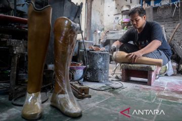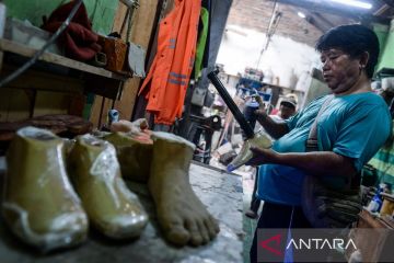 Pekerja menyelesaikan pembuatan kaki palsu di Sanggar Organ Prosthetic Ali Saga, Neglasari, Kota Tangerang, Banten, Kamis (23/10/2025). Produksi kaki palsu berbahan resin fiber untuk penyandang tunadaksa tersebut dijual dari harga Rp7,5 juta-Rp18 juta per unit dengan proses pengerjaan selama sepekan. ANTARA FOTO/Putra M. Akbar/tom.