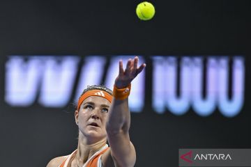 Petenis tunggal putri Republik Ceko Karolina Muchova melakukan servis ke arah petenis tunggal putri Yunani Maria Sakkari saat pertandingan semifinal tunggal putri turnamen tenis WTA Qatar Open 2026 di Doha, Qatar, Jumat (13/2/2026). Karolina Muchova berhasil menyingkirkan Maria Sakkari 3-6, 6-4, 6-1 dan melaju ke partai final. ANTARA FOTO/Xinhua/Nikku/agr
