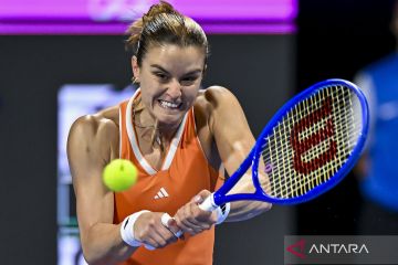 Petenis tunggal putri Yunani Maria Sakkari berusaha mengembalikan bola ke petenis tunggal putri Republik Ceko Karolina Muchova saat pertandingan semifinal tunggal putri turnamen tenis WTA Qatar Open 2026 di Doha, Qatar, Jumat (13/2/2026). Karolina Muchova berhasil menyingkirkan Maria Sakkari 3-6, 6-4, 6-1 dan melaju ke partai final. ANTARA FOTO/Xinhua/Nikku/agr