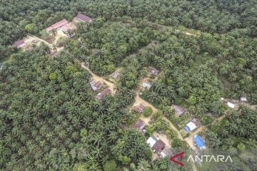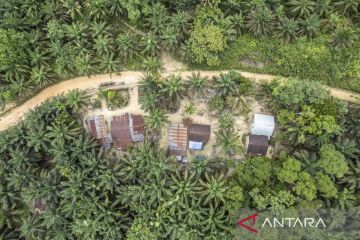 Foto udara kawasan Trans Sosial Suku Batin Sembilan di Muaro Singoan, Batang Hari, Jambi, Rabu (22/10/2025). Kawasan Trans Sosial yang dibangun pemerintah pada tahun 1999 untuk menyediakan ruang hidup bagi warga Suku Batin Sembilan di tengah hutan lebat Sumatera tersebut kini berubah menjadi kawasan perkebunan kelapa sawit milik perorangan dan beberapa perusahaan. ANTARA FOTO/Wahdi Septiawan/tom.