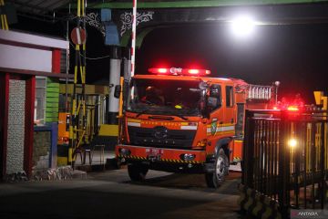 Sebuah mobil pemadam kebakaran meninggalkan kawasan kilang minyak seusai memadamkan api di area Hydrocracking Complex (HCC) yang terbakar di Kilang Minyak Putri Tujuh Pertamina RU II Dumai, Riau, Rabu (1/10/2025). Manajer Humas Pertamina Refinery Unit II Dumai Agustiawan menyatakan kebakaran di Kilang Minyak Pertamina Dumai terjadi di area HCC dan penyebab kebakaran yang membuat lima warga yang tinggal dekat kawasan kilang dilarikan ke rumah sakit untuk mendapatkan perawatan medis itu masih dalam penyelidikan. ANTARA FOTO/Aswaddy Hamid/foc.