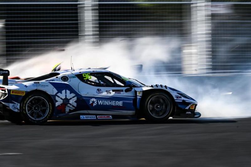 Anthony Liu dari Phantom Global Racing dari China/Dorian Boccolacci dari Prancis (kanan) bersaing selama sesi kualifikasi GT World Challenge Asia di Beijing di Beijing Economic-Technological Development Area (E-Town) Beijing, China, 18 Oktober 2025. ANTARA/Xinhua/Zheng Huansong