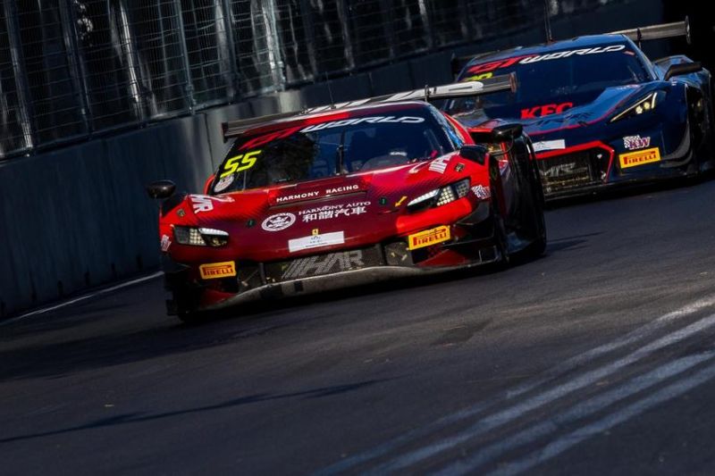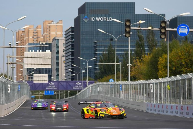 Pembalap China Zhang Yaqi/Ye Yifei dari Harmony Racing (depan) bersaing selama GT World Challenge Asia Race 2 di Beijing Street Circuit di Beijing Economic-Technological Development Area (E-Town) dari Beijing, China, 19 Oktober 2025. ANTARA/Xinhua/Liu Mengqi
