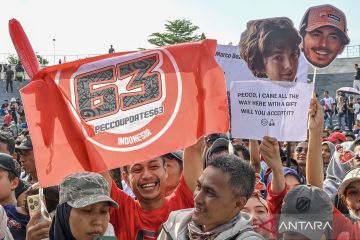 Sejumlah penggemar Francesco Bagnaia memajang poster saat mengikuti MotoGP Riders Parade di Jalan Udayana, Mataram, NTB, Rabu (1/10/2025). Parade yang diikuti 10 pembalap nasional dan internasional di antaranya Francesco Bagnaia, Marco Bezzecchi, Luca Marini, Brad Binder, Miguel Oliveira, Raul Fernandez, Franco Morbidelli, Fabio Di Giannantonio, Somkiat Chantra, dan Mario Aji tersebut digelar untuk memeriahkan Pertamina Grand Prix Of Indonesia 2025 seri ke 18 yang akan diselenggarakan di Sirkuit Mandalika pada 3 hingga 5 Oktober 2025. ANTARA FOTO/Ahmad Subaidi/sgd