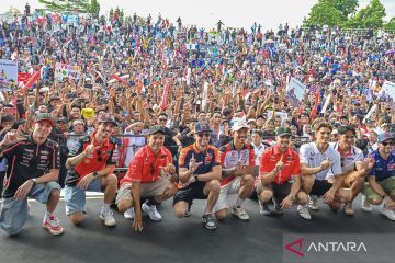 Sejumlah pembalap MotoGP berpose dengan penggemarnya saat mengikuti MotoGP Riders Parade di Jalan Udayana, Mataram, NTB, Rabu (1/10/2025). Parade yang diikuti 10 pembalap nasional dan internasional di antaranya Francesco Bagnaia, Marco Bezzecchi, Luca Marini, Brad Binder, Miguel Oliveira, Raul Fernandez, Franco Morbidelli, Fabio Di Giannantonio, Somkiat Chantra, dan Mario Aji tersebut digelar untuk memeriahkan Pertamina Grand Prix Of Indonesia 2025 seri ke 18 yang akan diselenggarakan di Sirkuit Mandalika pada 3 hingga 5 Oktober 2025. ANTARA FOTO/Ahmad Subaidi/sgd
