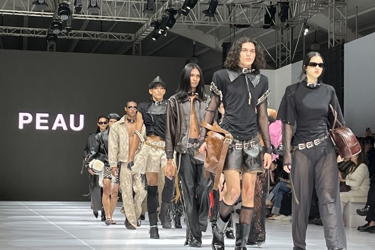 Penampilan jenama lokal PEAU, dalam runway Infinix di Jakarta Fashion Week 2026 di Pondok Indah Mall 3, Jakarta, Senin (27/10/2025). (ANTARA/Sri Dewi Larasati)Jenama fesyen PEAU membawa koleksi “Nomadic Ease” karya Canesia Andhani Soekotjo, yang mengekspresikan ketenangan ditengah dinamika hidup melalui perpaduan kulit, wol, dan tekstur ular.