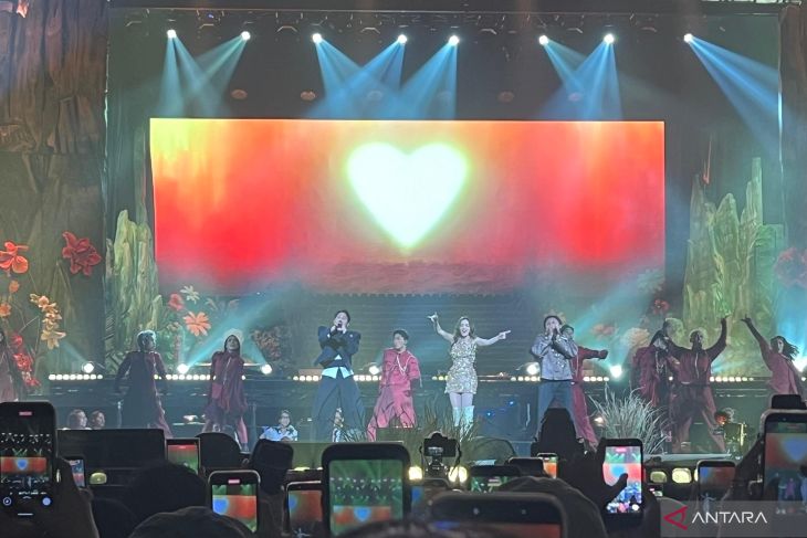 Penampilan duet Mahalini Raharja dan Rizky Febian dalam konser “KOMA Live in Concert” yang digelar di Istora Senayan, Jakarta, pada Sabtu (14/2/2026) malam. (ANTARA/Sri Dewi Larasati)Panggung konser itu semakin semarak ketika Mahalini mengajak suaminya, Rizky Febian, untuk membawakan lagu duet mereka, “Bermuara”, di mana keduanya bernyanyi sambil bergandengan tangan.