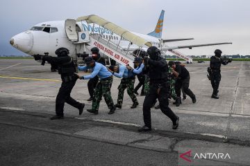 Prajurit Komando Pasukan Katak (Kopaska) TNI AL melakukan penyelamatan sandera saat latihan pasukan khusus Kopaska TA 2026 di Lanudal Juanda, Sidoarjo, Jawa Timur, Senin (27/4/2026). Dalam latihan tersebut prajurit Kopaska ditekankan untuk mengutamakan faktor keamanan sehingga prajurit Kopaska dapat menjadi prajurit yang profesional dalam penanganan aksi terorisme atau gangguan keamanan di Indonesia. ANTARA FOTO/Muhammad Adimaja/bar