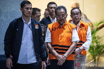 Mantan Direktur Utama PT Hutama Karya (HK) (Persero) Bintang Perbowo (kedua kanan) bersama mantan Kepala Divisi Pengembangan Bisnis dan Investasi PT HK (Persero) M Rizal Sutjipto (kedua kiri) dikawal petugas KPK saat dihadirkan sebagai tersangka pada konferensi pers di Gedung Merah Putih KPK, Jakarta, Rabu (6/8/2025). KPK menahan dua tersangka yaitu mantan Dirut PT HK (Persero) Bintang Perbowo dan mantan Kepala Divisi Pengembangan Bisnis dan Investasi PT HK (Persero) M Rizal Sutjipto terkait dugaan kasus korupsi pengadaan lahan di sekitar Jalan Tol Trans Sumatera (JTTS) tahun anggaran 2018-2020, yang mengakibatkan kerugian negara sekitar Rp205,14 miliar. ANTARA FOTO/Bayu Pratama S/YU