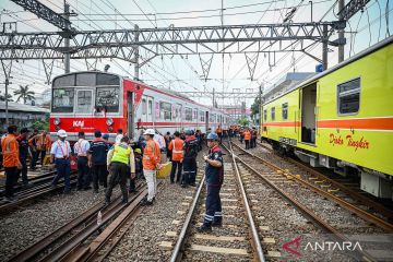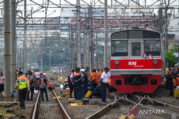 Sejumlah petugas mengevakuasi rangkaian KRL Commuter Line nomor 1189 relasi Bogor-Jakarta Kota yang anjlok di emplasemen Stasiun Jakarta Kota, Jakarta, Selasa (5/8/2025). Akibat kejadian tersebut, PT KAI Commuter Line melakukan rekayasa pola operasi yaitu perjalanan KRL Commuter Line tujuan Stasiun Jakarta Kota dari Stasiun Bogor perjalanannya hanya sampai Stasiun Manggarai. ANTARA FOTO/Fauzan/nym.