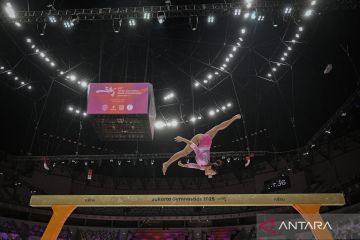Pesenam putri Indonesia Salsabilla Hadi Pamungkas berlatih saat sesi latihan Kejuaraan Dunia Gimnastik 2025 atau 53rd FIG Artistic Gymnastics World Championships 2025 di Indonesia Arena, Jakarta, Sabtu (18/10/2025). Pesenam putri Indonesia menjalani sesi latihan resmi jelang Kejuaraan Dunia Gimnastik 2025 sebelum bertanding pada 19-25 Oktober 2025 di Indonesia Arena. ANTARA FOTO/Fauzan/nz