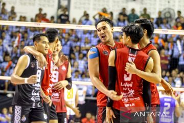 Pebola voli LavAni Navy Hendra Kurniawan (tengah) melakukan selebrasi bersama rekannya usai mencetak poin saat melawan TNI AU Electric pada pertandingan Grand Final Livoli Divisi Utama di GOR Ki Mageti, Magetan, Jawa Timur, Minggu (19/10/2025). LavAni Navy berhasil menjadi juara pertama Livoli Divisi Utama setelah menang atas TNI AU Electric dengan skor 3-0 (25-21, 28-26, 25-14) . ANTARA FOTO/Muhammad Mada/tom.