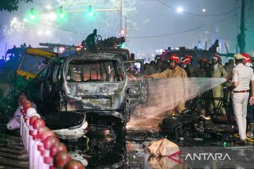 Kondisi mobil-mobil hancur akibat ledakan di dekat Gerbang No. 1 Stasiun Metro Red Fort di New Delhi, India, Senin (10/11/2025). Ledakan mengakibatkan delapan orang meninggal dunia dan 12 orang luka-luka. ANTARA FOTO/Sanjeev Verma/Hindustan Times/rwa.