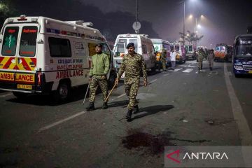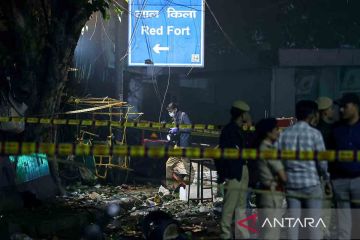 Petugas berjalan dekat lokasi ledakan di kawasan tua Delhi, India, Senin (10/11/2025). ANTARA FOTO/REUTERS/Adnan Abidi/rwa.