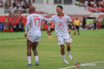 Pesepak bola Malut United David Da Silva (kiri) dan Igor Inocencio De Oliveira (kanan) melakukan selebrasi usai mencetak gol ke gawang Borneo FC pada pertandingan lanjutan BRI Super League di Stadion Gelora Kie Raha Ternate, Maluku Utara, Minggu (28/12/2025). Malut United berhasil mengalahkan Borneo FC dengan skor akhir 3-2. ANTARA FOTO/Andri Saputra/wpa