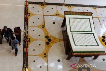 Pengunjung melintas di depan mushaf kitab suci Al Quran berukuran jumbo 3x2 meter di Masjid Raya Sheikh Zayed Solo, Jawa Tengah, Sabtu (28/2/2026). Mushaf tulis tangan karya Universitas Sains Al-Qur'an (UNSIQ) Wonosobo itu merupakan pemberian Presiden ke-7 RI Joko Widodo kepada pengurus masjid setempat untuk dipamerkan sebagai daya tarik bagi pengunjung dan wisatawan. ANTARA FOTO/Maulana Surya/tom.