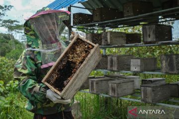 Dua peternak memanen sarang lebah trigona pada peternakan lebah kelompok tani makmur sejahtera di Kecamatan Kambu, Kendari, Sulawesi Tenggara, Minggu (16/11/2025). Menurut peternak, budidaya lebah jenis trigona cocok diterapkan pada daerah perkotaan karena aman dari sengat dan cukup menjanjikan sebab dalam sekali panen skala besar mampu menghasilkan sebanyak 50 botol madu jenis klanceng ukuran 500 ml dengan harga Rp180 ribu per botol yang kemudian dipasarkan ke berbagai daerah di Sulawesi hingga ke Jawa. ANTARA FOTO/Andry Denisah/bar