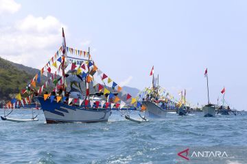 Sejumlah warga mengikuti parade perahu hias pada Ketupat Bahari 2026 di Leato Selatan, Kota Gorontalo, Gorontalo, Sabtu (28/3/2026). Sebanyak 70 perahu nelayan memeriahkan Ketupat Bahari 2026 yang digelar dalam perayaan Lebaran Ketupat untuk mempererat silaturahim antarwarga sekitar. ANTARA FOTO/Adiwinata Solihin/bar