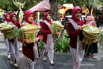 Warga membawa ketupat coklat menggunakan bakul saat kirab ketupat coklat di kawasan desa wisata Kampung Coklat Blitar, Jawa Timur, Sabtu (28/3/2026). Kirab yang digelar sebagai perwujudan rasa syukur dan memperingati hari ke-7 bulan Syawal dalam penanggalan hijriah atau yang lebih dikenal dengen tradisi Bakdhan Kupat tersebut menampilkan olahan ketupat yang dibuat dari olahan ketupat berbahan beras yang dipadukan dengan bubuk coklat, sebagai identitas desa wisata setempat. ANTARA FOTO/Irfan Anshori/bar