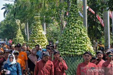 Warga mengarak tumpeng ketupat saat pawai perayaan Lebaran Ketupat di Durenan, Trenggalek, Jawa Timur, Sabtu (28/3/2026). Lebaran Ketupat di daerah ini ini telah menjadi tradisi khas masyarakat pesisir selatan Trenggalek sejak puluhan tahun lalu yang berakar dari ajaran keislaman yang menekankan nilai kebersamaan dan sedekah pada H+7 Idul Fitri atau setelah enam hari pelaksanaan ibadah puasa Syawal, yang kemudian berkembang menjadi ikon wisata budaya religi yang banyak direplikasi komunitas Muslim di berbagai wilayah Tanah Air. ANTARA FOTO/Destyan Sujarwoko/bar
