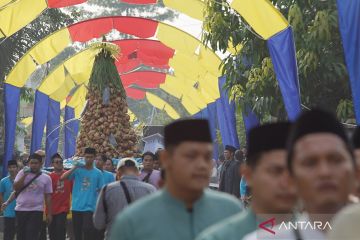 Warga berebut gunungan ketupat, lepet, dan hasil bumi saat Parade Sewu Kupat di Desa Colo, Dawe, Kabupaten Kudus, Jawa Tengah, Sabtu (28/3/2026). Parade Sewu Kupat digelar untuk memperingati Lebaran Ketupat yang jatuh sepekan setelah Hari Raya Idul Fitri sebagai bentuk rasa syukur masyarakat kepada Tuhan Yang Maha Esa dan mempererat kebersamaan antarwarga. ANTARA FOTO/Nirza/agr/bar