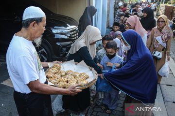 Sejumlah warga membagikan ketupat taoge kepada anak-anak dalam tradisi Syawalan di Kampung Pedurungan Tengah, Semarang, Jawa Tengah, Sabtu (28/3/2026). Tradisi turun temurun yang diadakan sejak tahun 1950-an dengan membagikan ketupat berisi sayuran taoge dan uang sedekah kepada masyarakat umum tersebut untuk merayakan serta menjaga tradisi Syawalan usai merayakan Idul Fitri 1447 Hijriah sekaligus sebagai upaya menjaga kerukunan dan gotong royong antarwarga setempat. ANTARA FOTO/Makna Zaezar/bar