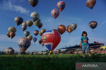 Sejumlah warga melihat balon udara terbang dengan cara ditambatkan di tanah saat menghadiri final Pekalongan Balloon Festival di Stadion Hoegeng, Kota Pekalongan, Jawa Tengah, Sabtu (28/3/2026). Pemerintah Kota Pekalongan menggelar Pekalongan Balloon Festival yang diikuti 40 kelompok peserta pada final dengan menerbangkan balon udara yang telah ditambatkan pada tanah bertujuan untuk menjaga tradisi Syawalan usai merayakan Idul Fitri 1447 H dan sebagai upaya menertibkan balon udara agar tidak diterbangkan secara liar yang dapat mengganggu lalu lintas udara. ANTARA FOTO/Harviyan Perdana Putra/bar