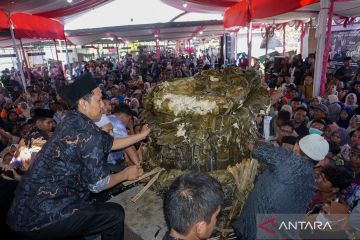 Panitia memotong lopis saat tradisi Syawalan pemotongan lopis raksasa di Krapyak, Kota Pekalongan, Jawa Tengah, Sabtu (28/3/2026). Pemotongan lopis raksasa berukuran diameter 262 centimeter, tinggi 239 centimeter dan berat 2.083 kilogram untuk dibagikan kepada warga itu merupakan tradisi Syawalan usai Idul Fitri 1447 H sekaligus sebagai wadah silaturahmi antarwarga. ANTARA FOTO/Harviyan Perdana Putra/bar