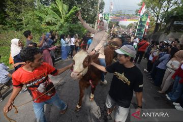 Warga menunggang hewan ternak saat Tradisi Lebaran Sapi di lereng Gunung Merapi, Mlambong, Sruni, Musuk, Boyolali, Jawa Tengah, Sabtu (28/3/2026). Tradisi Lebaran Sapi yang telah dilakukan turun temurun oleh warga setempat pada Lebaran Ketupat itu sebagai wujud menjaga relasi sosial antarwarga serta rasa syukur kepada Tuhan Yang Maha Esa atas hasil ternak sapi dan kambing yang baik sebagai penyangga ekonomi warga. ANTARA FOTO/Aloysius Jarot Nugroho/bar