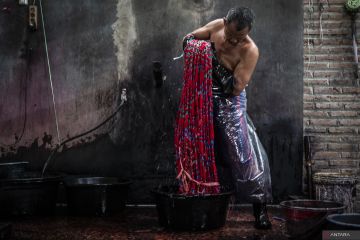 Perajin menyelesaikan proses pewarnaan benang untuk pembuatan kain tenun ikat Troso di rumah produksi Aida Tenun, Desa Troso, Pecangaan, Jepara, Jawa Tengah, Kamis (2/10/2025). Menurut sejumlah perajin setempat, produksi kain tenun khas Jepara yang dibuat secara tradisional dengan Alat Tenun Bukan Mesin (ATBM) itu mencapai sekitar 500 potong per bulan, dengan harga jual mulai Rp75.000 hingga Rp500.000 per potong dan dipasarkan tidak hanya ke berbagai daerah di Indonesia, tetapi juga ke Myanmar, Thailand, dan Australia. ANTARA FOTO/Aprillio Akbar/foc.