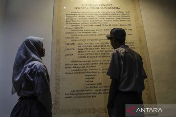 Siswa mengamati displai naskah putusan kongres pemuda-pemuda Indonesia usai mengikuti upacara peringatan Hari Sumpah Pemuda di Museum Sumpah Pemuda, Jakarta, Selasa (28/10/2025). Museum dan Cagar Budaya Kementerian Kebudayaan menggelar upacara untuk memperingati Hari Sumpah Pemuda ke-97 sebagai bentuk penghormatan atas semangat para pemuda. ANTARA FOTO/Asprilla Dwi Adha/YU