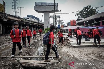 Sejumlah siswa berjalan menuju sekolah di Sekolah Darurat Kartini, Pademangan, Jakarta, Kamis (31/10/2025). Sekolah alternatif yang berdiri sejak tahun 1990 itu merupakan sekolah yang memberikan pendidikan gratis bagi kalangan anak marginal usia 4-18 tahun yang berasal dari keluarga tidak mampu. ANTARAFOTO/Muhammad Rizky Febriansyah/rwa.