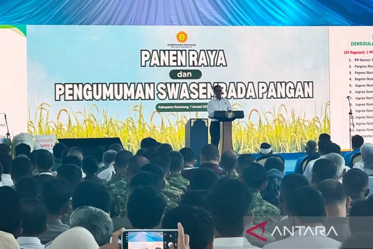 Menteri Pertanian Andi Amran Sulaiman berbicara dalam Panen Raya dan Pengumuman Swasembada Pangan oleh Presiden RI Prabowo Subianto yang dihadiri 5000 petani/penyuluh secara luring dan dua juta petani secara daring di Karawang, Jawa Barat, Rabu (7/1/2025). ANTARA/Harianto.Dia menegaskan, hal itu merupakan gagasan dan kebijakan besar Presiden Prabowo yang kemudian dilaksanakan Kementerian Pertanian, dibantu TNI-Polri, Kejaksaan, Kementerian Perdagangan, BUMN, Komisi IV DPR.