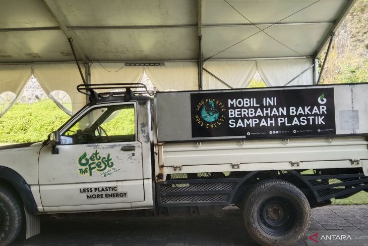 Kendaraan operasional Yayasan Get Plastic Indonesia yang telah menggunakan BBM dari sampah plastik di sela pameran mini di Garuda Wisnu Kencana (GWK) Kabupaten Badung, Bali, Jumat (30/1/2026). ANTARA/Dewa Ketut Sudiarta WigunaPeluang BBM plastik