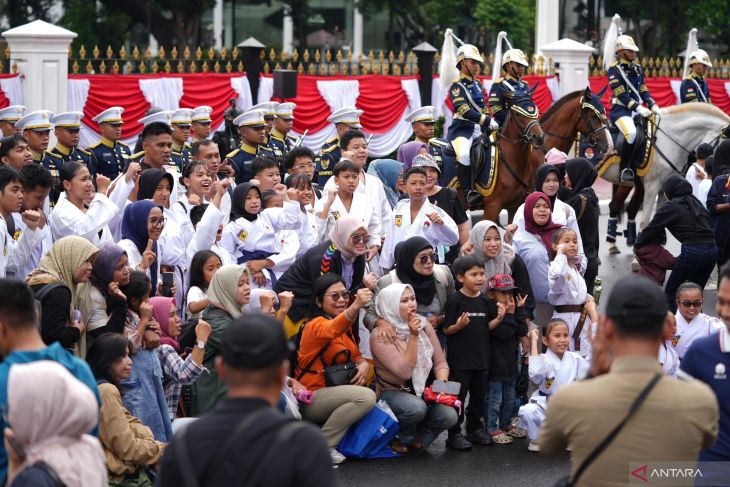 Sejumlah warga dan wisatawan berfoto bersama prajurit Pasukan Pengamanan Presiden (Paspampres) selepas upacara pergantian pasukan jaga Istana Merdeka atau Serah Terima Kawal Istana Merdeka di depan Istana Merdeka, Jalan Medan Merdeka Utara, Jakarta, Minggu (8/2/2026). ANTARA/HO-PPID Paspampres.