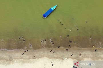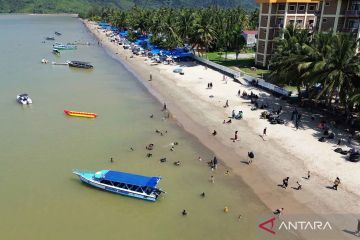 Foto udara wisatawan menikmati keindahan pantai saat libur Lebaran 1447 Hijriah di Pantai Pandan, Kabupaten Tapanuli Tengah, Sumatera Utara, Minggu (22/3/2026). Objek wisata Pantai Pandan Tapanuli Tengah mulai dikunjungi wisata lokal dan mancanegara di tengah upaya pemulihan daerah itu yang terkena bencana longsor dan banjir bandang pada akhir November 2025. ANTARA FOTO/Yudi Manar/nym.