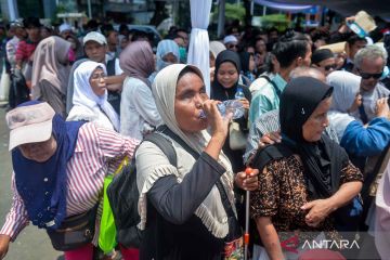 Warga duduk saat menunggu antrean halalbihalal dengan Presiden Prabowo Subianto di pintu masuk Kementerian Sekretariat Negara, Jakarta, Sabtu (21/3/2026). Presiden Prabowo Subianto menggelar open house di Istana Kepresidenan saat Idul Fitri 1447 Hijriah untuk masyarakat umum dengan kapasitas sekitar 5.000 orang yang berlangsung pada siang hingga sore hari. ANTARA FOTO/Putra M. Akbar/nym.
